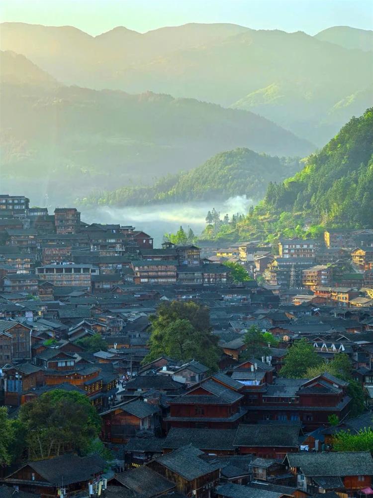 🍁 Tây Giang Thiên Hộ Miêu Trại – ngôi làng cổ nổi tiếng với nghìn mái nhà sàn gỗ soi bóng núi rừng, nơi gìn giữ bản sắc dân tộc Miêu hùng vĩ và đậm đà.