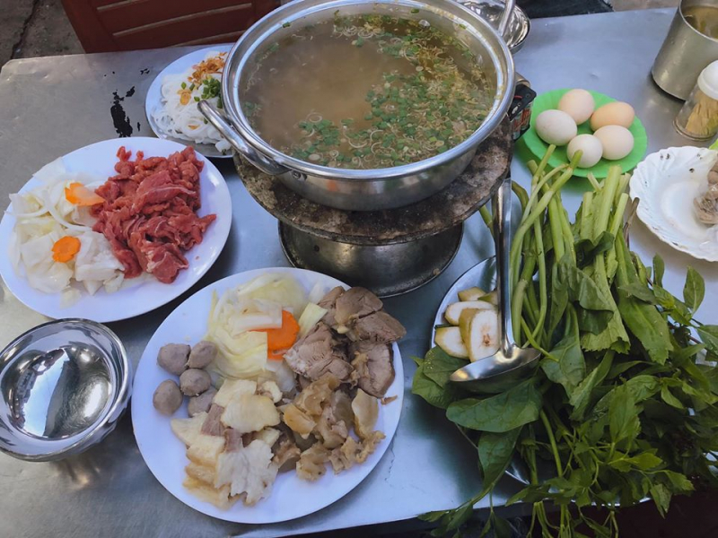 Distinguished from the normal buffalo and fermented rice hotpot, Long Xuyen buffalo hotpot has its own features that visitors will hardly find elsewhere. The hotpot broth is simmered from buffalo bones and meat to create a rich flavor.