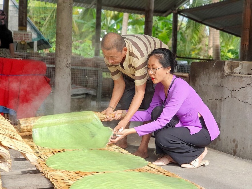 Tourists can witness the entire process of making a hu tieu pizza and taste the dish on the spot or buy and bring home for VND 100,000/pizza. It is best, however, to try the dish on the spot because the longer it is left after cooking, the cooler and less crunchy it can get.